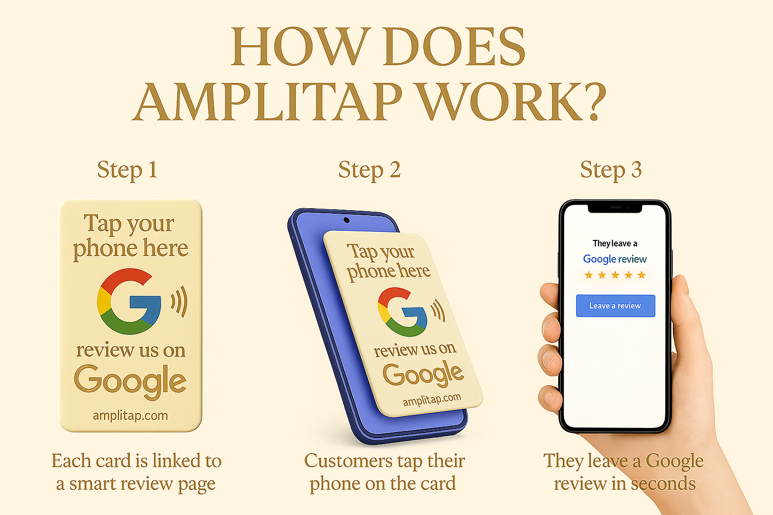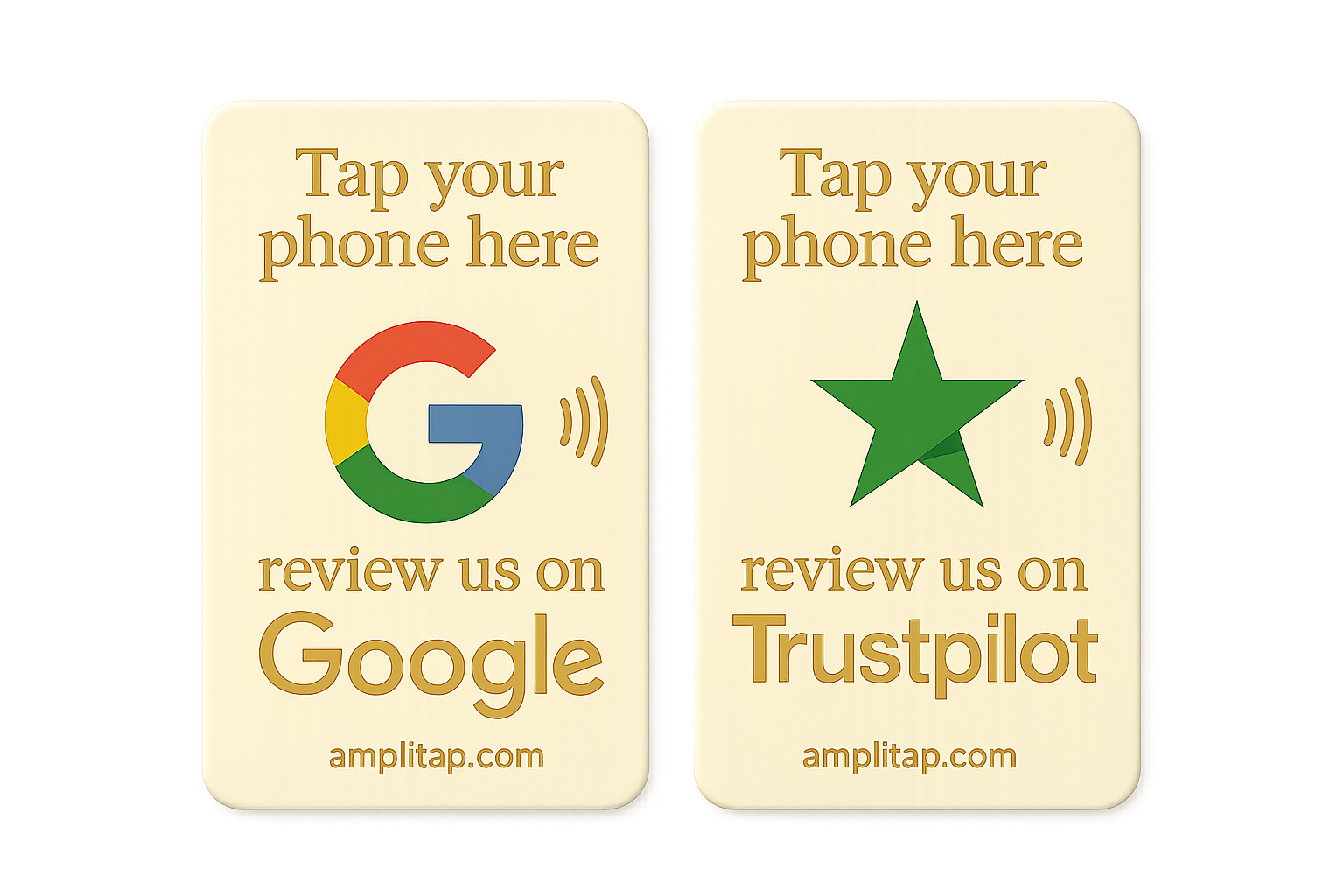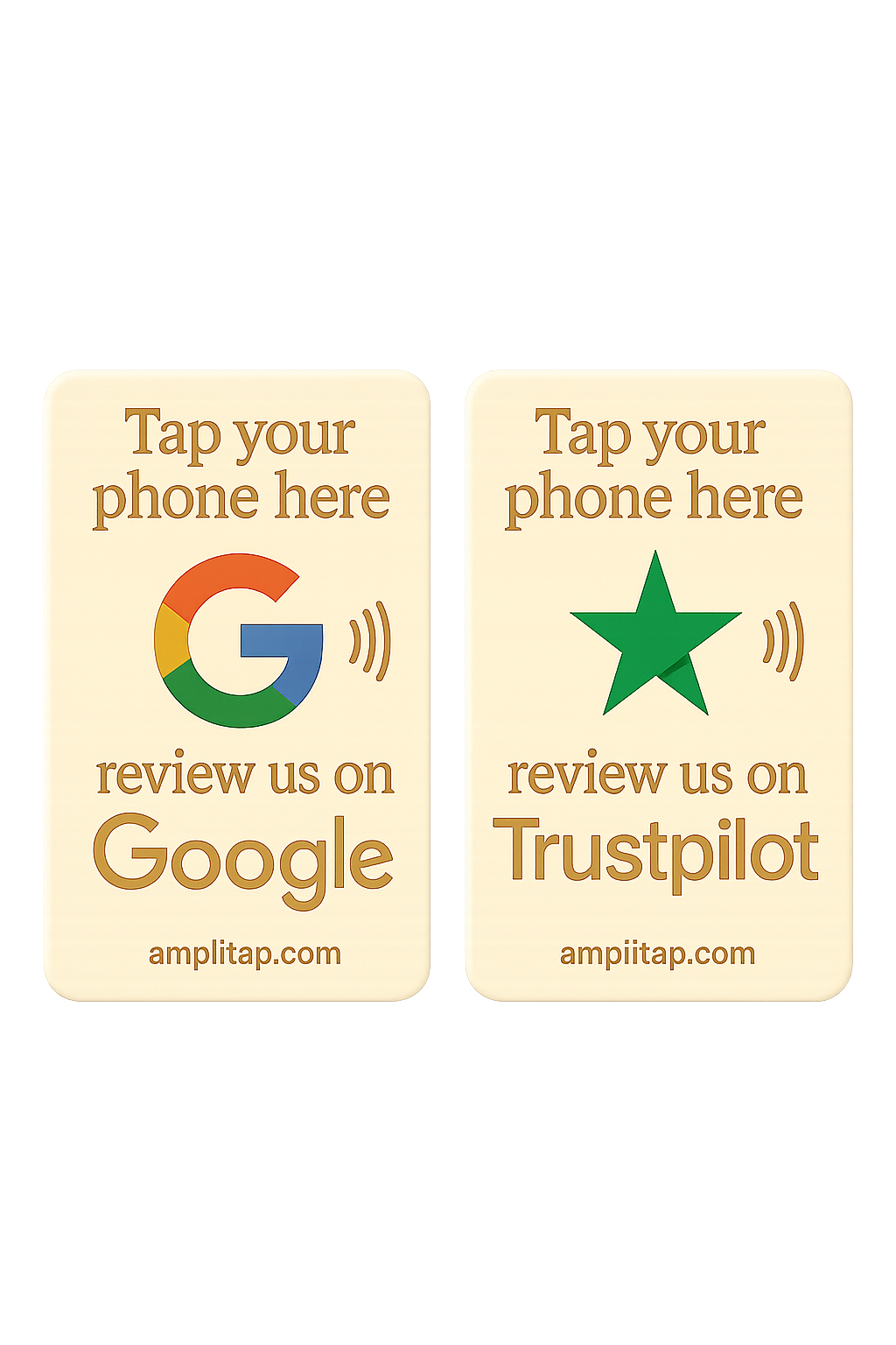Amplitap uses NFC and QR technology to guide your customers to leave a review with a simple tap or scan — no app required. Each card is linked to a smart landing page that routes reviews based on the customer’s experience.